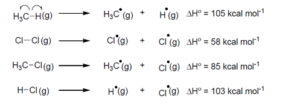 \mathrm{CH}_4(\mathrm{~g})+\mathrm{Cl}_2(\mathrm{~g}) \xrightarrow{\text { light }} \mathrm{CH}_3 \mathrm{Cl}(\mathrm{~g})+\mathrm{HCl}(\mathrm{~g})