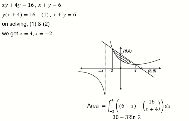 The area enclosed by the curves xy+4y=16 and x+y=6 is equal to :