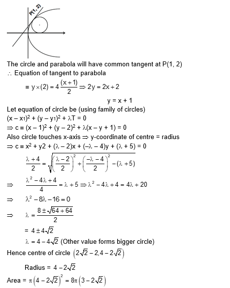 The area (in sq. units) of the smaller of the two circles that touch the parabola, $y^2=4 x$ at the point $(1,2)$ and the x-axis is :