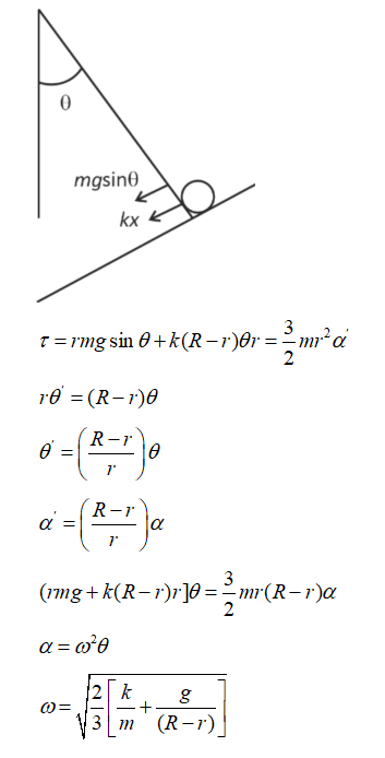The center of a disk of radius r and mass m is attached to a spring of spring constant k, inside a ring of radius R > r as shown in the figure. The other end of the spring is attached on the periphery of the ring. Both the ring and the disk are in the same vertical plane. The disk can only roll along the inside periphery of the ring, without slipping. The spring can only be stretched or compressed along the periphery of the ring, following the Hooke's law. In equilibrium, the disk is at the bottom of the ring. Assuming small displacement of the disc, the time period of oscillation of center of mass of the disk is written as $T=\frac{2 \pi}{\omega}$. The correct expression for $\omega$ is (g is the acceleration due to gravity):