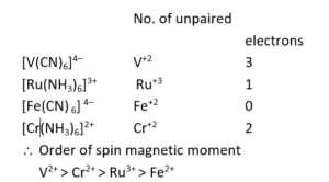 The correct order of the spin-only magnetic moment of metal ions in the following low-spin complexes, $\left[\mathrm{V}(\mathrm{CN})_6\right]^{4-},\left[\mathrm{Fe}(\mathrm{CN})_6\right]^{4-},\left[\mathrm{Ru}\left(\mathrm{NH}_3\right)_6\right]^{3+}$ and $\left[\mathrm{Cr}\left(\mathrm{NH}_3\right)_6\right]^{2+}$, is: