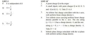 The electric field E is measured at a point P(0, 0, d) generated due to various charge distributions and the dependence of E on d is found to be different for different charge distributions. List-I contains different relations between E and d. List-II describes different electric charge distributions, along with their locations. Match the functions in List-I with the related charge distributions in List-II.