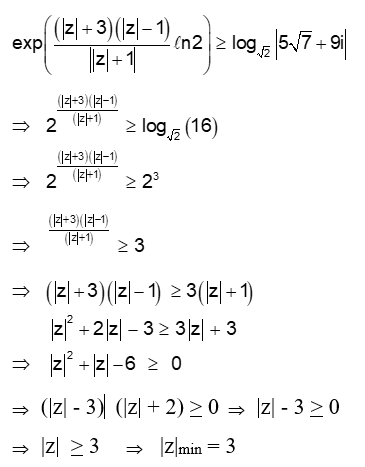 \exp \left(\frac{(|z|+3)(|z|-1)}{||z|+1|} \log _e 2\right) \geq \log _{\sqrt{2}}|5 \sqrt{5}+9 i|, i=\sqrt{-1}