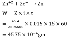 The mass of zinc produced by the electrolysis of zinc sulphate solution with a steady current of 0.015 A for 15 minutes is $\times 10^{-4} \mathrm{~g}$. (Atomic mass of zinc =65.4amu )