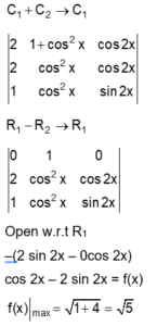 The maximum value of $$ f(x)=\left|\begin{array}{ccc} \sin ^2 & 1+\cos ^2 x & \cos 2 x \\ 1+\sin ^2 x & \cos ^2 x & \cos 2 x \\ \sin ^2 x & \cos ^2 x & \sin 2 x \end{array}\right|, x \in R $$