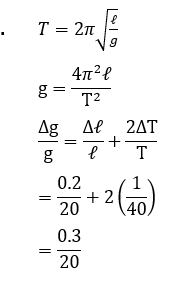 The measured value of the length of a simple pendulum is 20" " cm with 2" " mm accuracy. The time for 50 oscillations was measured to be 40 seconds with 1 second resolution. From these measurements, the accuracy in the measurement of acceleration due to gravity is N%. The value of N is: