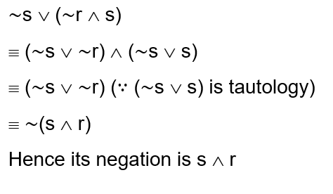 The negation of the Boolean expression $\sim s \vee(\sim r \wedge s)$ is equivalent to: