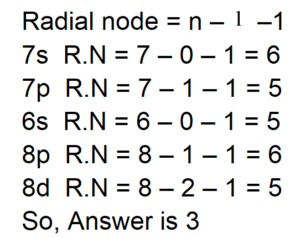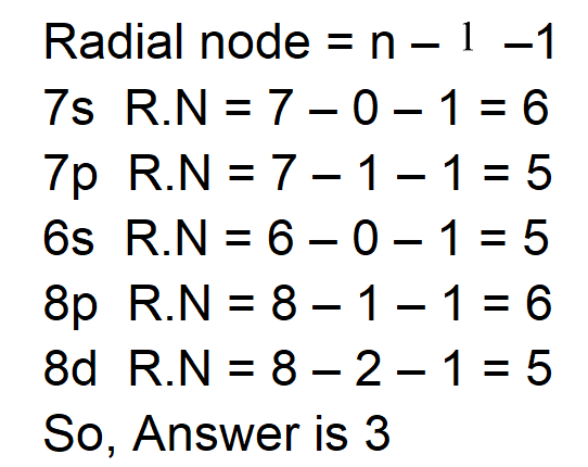 The number of atomic orbitals from the following having 5 radial nodes is ______.7s, 7p, 6s, 8p, 8d