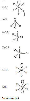 The number of species from the following carrying a single lone pair on central atom Xenon is ____ $\mathrm{XeF}_5^{+}, \mathrm{XeO}_3, \mathrm{XeO}_2 \mathrm{~F}_2, \quad \mathrm{XeF}_5^{-}, \quad \mathrm{XeO}_3 \mathrm{~F}_2, \quad \mathrm{XeOF}_4, \quad \mathrm{XeF}_4$