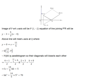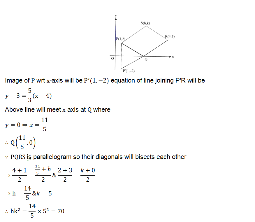 A ray of light coming from the point P(1,2) gets reflected from the point Q on the x-axis and then passes through the point R(4,3). If the point S(h, k) is such that PQRS is a parallelogram, then hk^2 is equal to :