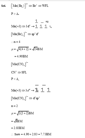 The sum of the spin only magnetic moment values (in B.M.) of $\left[\mathrm{Mn}(\mathrm{Br})_6\right]^{3-}$ and $\left[\mathrm{Mn}(\mathrm{CN})_6\right]^{3-}$ is $\_\_\_\_$ .