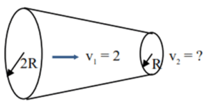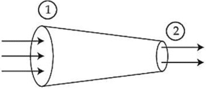 The tube of length L is shown in the figure. The radius of cross section at the point (1) is 2 cm and at the point (2) is 1 cm, respectively. If the velocity of water entering at point (1) is 2 m/s, then velocity of water leaving the point (2) will be