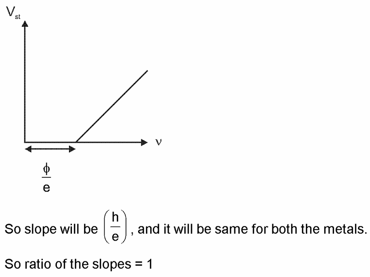 The work functions of Silver and Sodium are 4.6 and 2.3 eV , respectively. The ratio of the slope of the stopping potential versus frequency plot for Silver to that of Sodium is :