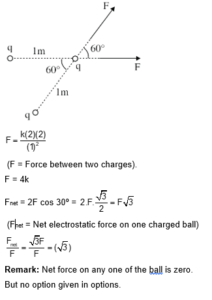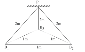 Three identical charged balls each of charge 2C are suspended from a common point P by silk threads of 2m each (as shown in figure). They form an equilateral triangle of side 1m. The ratio of net force on a charged ball to the force between any two charged balls will be :