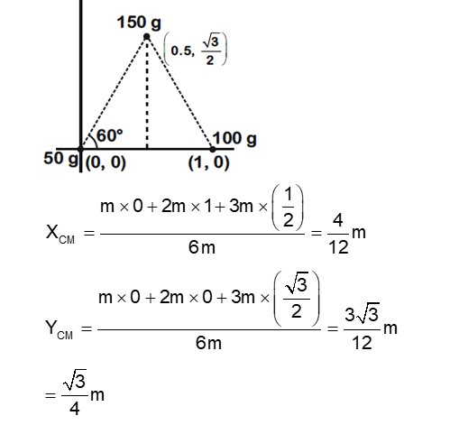 Three particles of masses, 50 g, 100 g and 150 g are placed at the vertices of an equilateral triangle of side 1 m (as shown in the figure). The (x, y) coordinates of the centre of mass will be :