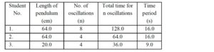 If $\mathrm{E}_1, \mathrm{E}_2$ and $\mathrm{E}_3$ are the percentage errors in ' g ' for students 1,2 and 3 respectively, then the minimum percentage error is obtained by student no. $\_\_\_\_$ .