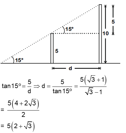 Two poles standing on a horizontal ground are of heights 5 m and 10 m respectively. The line joining their tops makes an angle of 15° with the ground. Then the distance (in m) between the poles, is: