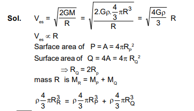 Two spherical planets $P$ and $Q$ have the same unfirom density $\rho$, masses $M_P$ and $M_Q$, an surface areas $A$ and $4 A$, respectively. A spherical planet $R$ also has unfirom density $\rho$ and its mass is $\left(M_p+M_Q\right)$. The escape velocities from the planets $\mathrm{P}, \mathrm{Q}$ and R , are $\mathrm{V}_{\mathrm{p}}, \mathrm{V}_0$ and V respectivley. Then