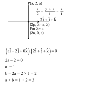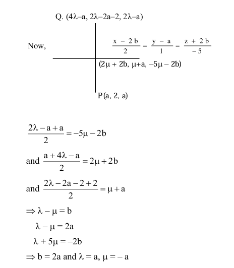 If the image of the point $\mathrm{P}(a, 2, a)$ in the line $\frac{x}{2}=\frac{y+a}{1}=\frac{z}{1}$ is Q and the image of Q in the line $\frac{x-2 b}{2}=\frac{y-a}{1}=\frac{z+2 b}{-5}$ is P , then $a+b$ is equal to