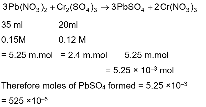 When 35 mL of 0.15 M lead nitrate solution is mixed with 20 mL of 0.12 M chromic sulphate solution, $\_\_\_\_$ $\times 10^{-5}$ moles of lead sulphate precipitate out. (Round off to the Nearest Integer).