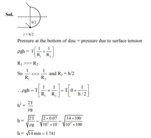 When water is filled carefully in a glass, one can fill it to a height $h$ above the rim of the glass due to the surface tension of water. To calculate $h$ just before water starts flowing, model the shape of the water above the rim as a disc of thickness $h$ having semicircular edges, as shown schematically in the figure. When the pressure of water at the bottom of this disc exceeds what can be withstood due to the surface tension, the water surface breaks near the rim and water starts flowing from there. If the density of water, its surface tension and the acceleration due to gravity are $10^3 \mathrm{~kg} \mathrm{~m}^{-3}$, $0.07 \mathrm{Nm}^{-1}$ and $10 \mathrm{~ms}^{-2}$, respectively, the value of h (in mm ) is $\_\_\_\_$ -
